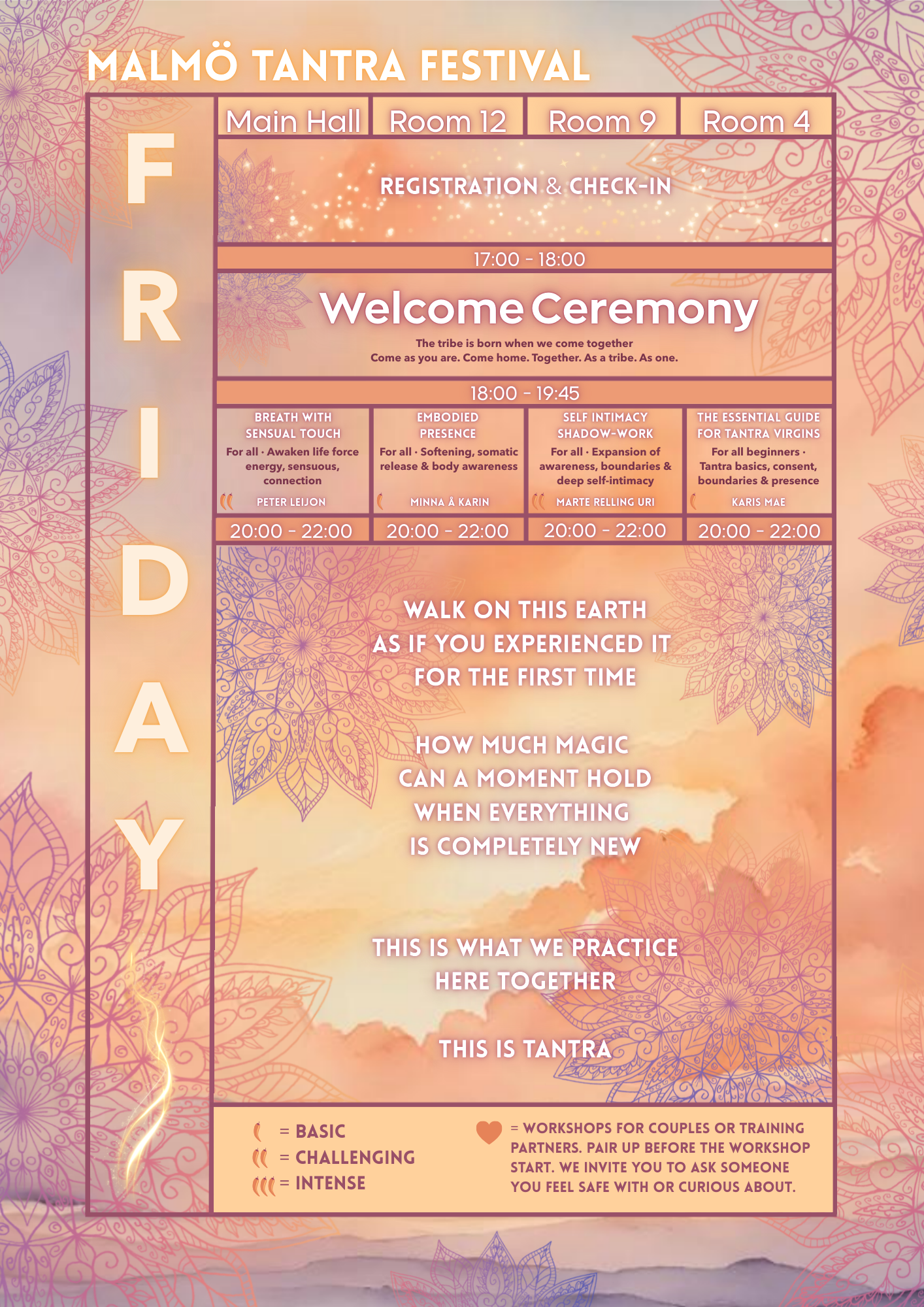 We are deeply honored to welcome you to a shared journey of tantric magic, a weekend not only to experience, but to transform, connect, and come more fully alive. You are invited to explore a variety of workshops led by a loving and diverse group of experienced facilitators, each creating safe and nourishing spaces for inner and relational exploration. Our guides come from across Europe, the Nordic countries, and Malmö’s local community.