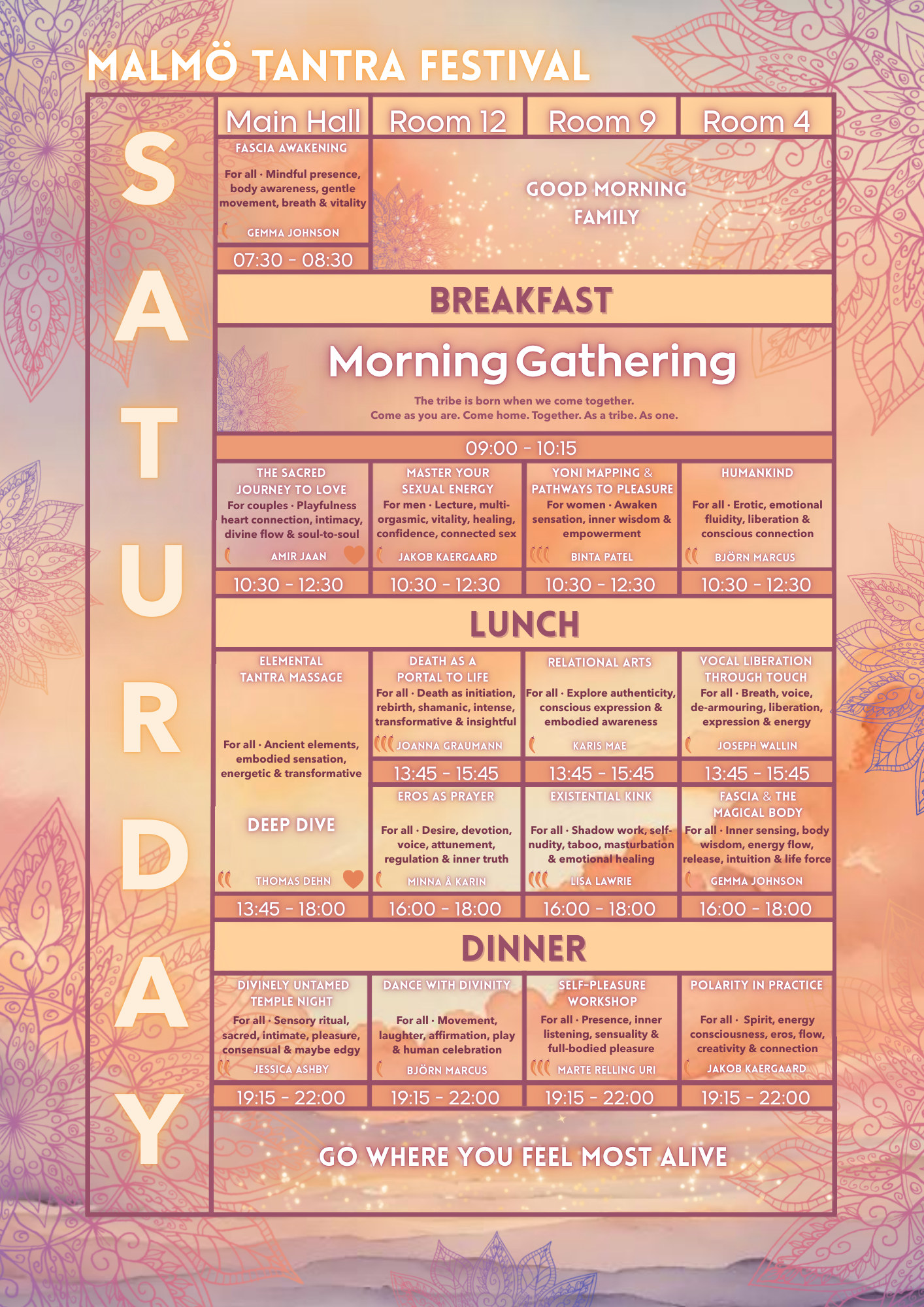 SATURDAY is a full day of workshops, flowing from 7:30 in the morning until 22:00 in the evening, offering space to explore, connect, and expand.